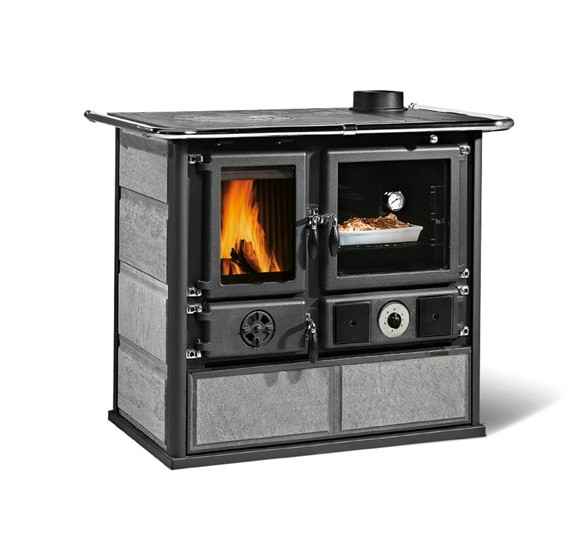 -Compartimento de cinzas removível -Revestimento interior da lareira em ferro fundido e aço -Placa e aros em ferro fundido polido -Portas, frente e aro em ferro fundido esmaltado - Ar primário e secundário ajustáveis -Sistema de pós-combustão (emissões muito baixas) -Gaveta removível para lenha -Forno de aço esmaltado de porcelana de 41L -Vidro cerâmico -Saída central de fumos superior e posterior -Classe Energética A+