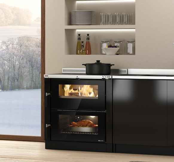 -Compartimento de cinzas removível -Frente em aço esmaltado -Forro interior da lareira em ferro fundido e Nordiker -Chapa e aros em ferro fundido polido - Porta em ferro fundido e porta do forno em aço esmaltado -Portas reversíveis -Estrutura em aço inoxidável -Porta corta-fogo com passagem interna de ar de combustão para limpeza de vidros e eficiência -Ar primário e secundário reguláveis -Sistema de pós-combustão (emissões muito baixas) -Forno de aço esmaltado de porcelana de 68L, com luz -Grelha cromada -Porta do forno com vidro duplo e juntas em inox -Possibilidade de captação do ar de combustão do exterior -Vidro cerâmico -Porta da lareira em ferro fundido com vidro duplo -Possibilidade de colocação entre móveis -Saída para fumos superior, posterior, lateral direita e lateral esquerda -Tabuleiro esmaltado -Classe Energética A+